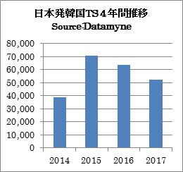 同社は、「日本発直航分と韓国TS分の傾向について、2017年分と4年前の2014年分を比較すると、直航分が6.4%減少し、韓国TS分が34.5%増加した形になっている。港別傾向としては、韓国TS分は博多、横浜、広島、門司の増加が目に目立つ。直航分については、横浜、神戸などの減少傾向に対して、東京の増加が目立つ。東京港の増加は2017年に顕著となった他港からのフィート分の増加によるものと見られる」と分析した。