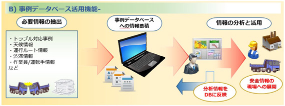 「事例データベース活用機能」は同社の過去のトラブル対応事例や、環境省のホームページに公表されている中間貯蔵事業に関する車両運行上のトラブル対応事例をデータベース化し、天候や運行ルート、渋滞などの情報と連携させることで、輸送の安全管理に必要となる情報を自動的に抽出することができる。抽出した情報を、管理者や各運転手・作業員に適切なタイミングで提示することにより、車両運行に関するトラブルを未然に防ぐ。