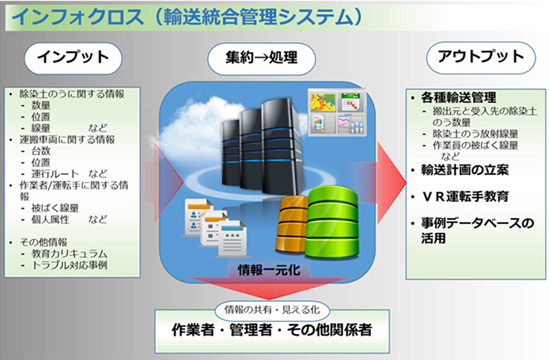 インフォクロスは、除染土のう、運搬車両、作業者などの位置や数、放射線量といった各種情報をリアルタイムに取得・集約して情報の一元化を図るシステム。これらの情報をすばやく適切に処理することで輸送に関する日常管理業務の効率化を実現するとともに、各運行ルートの交通状況の変化等を加味した最適な輸送順序と運行ルートを選定することができる。