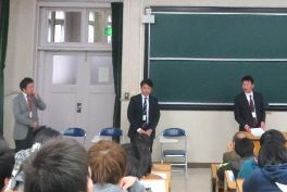1年生対象の講演会では、船長・機関長から海運業界について説明した後、現役の若手航海士・機関士が、「学生時代を振り返って」「海技者を志した動機」「乗船中の業務と生活」「陸上勤務について」などのテーマで講演した。2年生には海運業界の説明のほか、若手現役航海士・機関士が所定のテーマに関して自身の経験を紹介した。