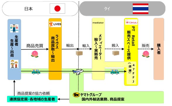 パラダイスパーク店を運営するPT リテイルコーポレーション(タイ・バンコク)、ライヴス(東京都渋谷区)、メディエーター(バンコク)、ヤマトグローバルロジスティクスジャパン(東京都中央区)の4社が連携し、輸出入手続き、輸配送、現地販売までをトータルで提供、日本の生産者の農水産品輸出拡大をサポートする。