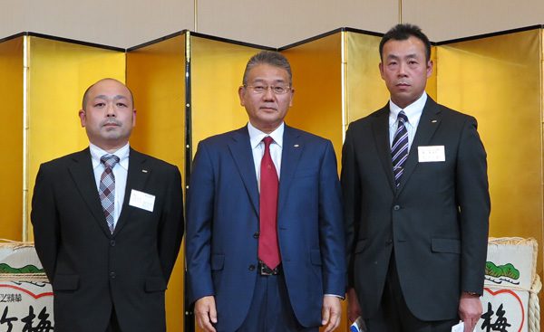 ▲(写真左から)SBSフレックネット野田営業所の竹本正美所長、SBSホールディングスの鎌田正彦社長、SBSフレックネット野田営業所の荒井正徳氏