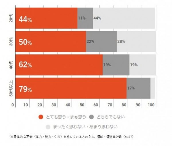 また、20代-40代からも、「どうしても力仕事が発生するから、また怪我の可能性もある」(20代男性)、「力仕事なので体力低下したらどうなるか」(30代男性)、「年齢を重ねると仕事につけなくなる」(30代男性)、「体力や腕力がこの先維持できるか分からない」(40代男性)といった声があがった。