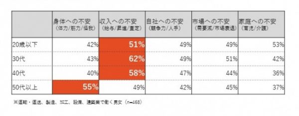調査によると、「今の職場で働くにあたっての将来の不安」に対し、20-40代は「収入への不安」、50代は「身体への不安(体力・筋力・ケガ)」が1番多い回答となった。