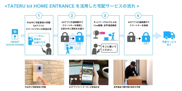 子会社で手軽にIoTの賃貸住宅を提供できるIoTサービス「Apartmentkit」(アパートメントキット)を開発・提供するロボットホームを通じ、一般の宅配事業者や出前、クリーニングなどすべての宅配サービスに対応する「TATERU kit HOME ENTRANCE」(タテルキット・ホームエントランス)を開発する。