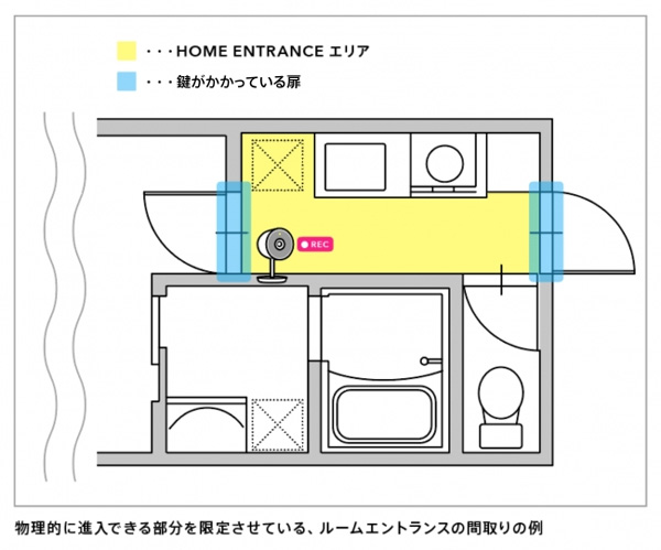 ルームエントランス部分は、物理的に侵入できる部分を限定させることで、セキュリティ面の強化を図る。また、ネットワークカメラを設置すれば、サービスのリアルタイム確認や荷物の置き場所などの要望を伝えられるようになる。
