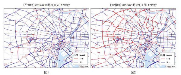 調査・データ富士通交通・道路データサービスと富士通鹿児島インフォネット、トランストロンの3社は8日、1月22日に発生した関東地方大雪時の物流貨物車両の走行状況を速報として分析した、と発表した。今後、関係機関とも連携して詳細な分析を行う。