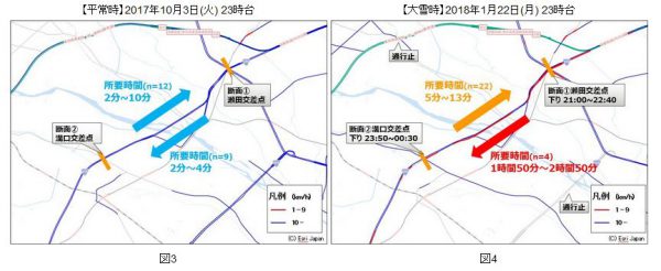 また、23時台に国道246号多摩川を通過した車両の断面(2.5キロ)の所要時間を算出した。下り方面で平常時2-4分で通行する区間が、大雪時は1時間50分-2時間50分かかっている。大雪時、首都高・第三京浜通行止の影響を受け、上り方面の通行量が多くなっている。