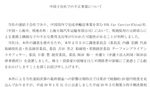 日本郵船は13日夜、中国子会社で完成車輸送を手がけるNYKカーキャリア・チャイナ社(上海)で現地採用の元幹部らによる業務上横領などの不正な費用支出が行われた可能性があると発表した。