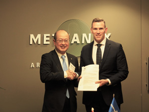 ▲2017年12月20日にバンクーバーで開催された調印式の様子、(写真左)日本郵船の近藤耕司経営委員(右)ウォーターフロントカンパニーのPaul Hexter社長