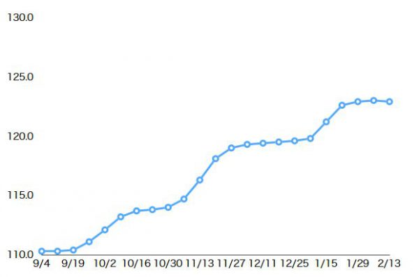 | 地域 | 2月13日(単位:円) | 2月5日(単位:円) | 上昇率 |
