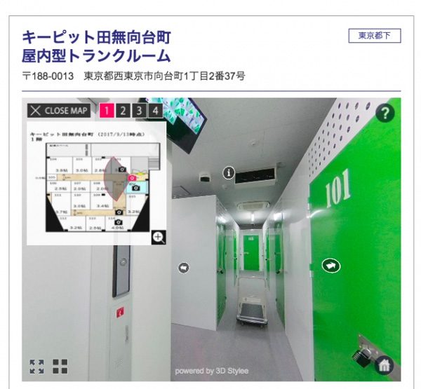 実験では、高品質な360度VRコンテンツを直感的な操作で制作することが可能だというクラウドソフト「3D Stylee(スリーディースタイリー)を活用。スマートフォンのウェブブラウザでトランクルームをVRモードで内見できるようにする。
