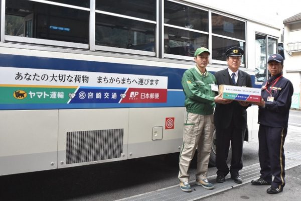 もともとは宮崎交通とヤマト運輸が2015年10月から実施している貨客混載事業に日本郵便が参画した。これまで1日3往復していた村所(むらしょ)郵便局-西都(さいと)郵便局間のうち、村所郵便局で引き受けた郵便物などを西都バスセンターまで輸送する片道1運行を路線バスで共同輸送する。