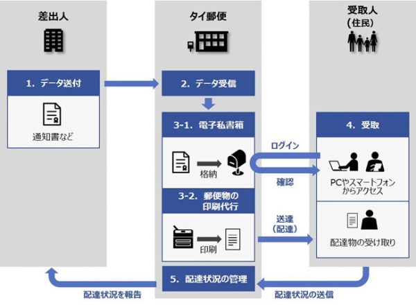 3者は共同で行政情報に関する地方部の住民へのより確実な連絡手段として、タイ全国の郵便ネットワークを活用した新しい情報提供サービスの実証を行う。具体的には、公共機関からの通知を、電子私書箱を試験導入してPCやスマートフォンで受取可能にするほか、住民の要望に応じて紙媒体での送達にも対応するなど、情報提供のためのサービス基盤の確立に向けて、課題抽出や効果を検証する。