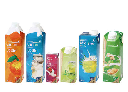 SIG社が開発した再開封可能な口栓付きの紙容器の「コンビドーム」や「コンビフィット」など、形態・容量・開封方法などが異なり、形状に特長のある100品種の製品を供給する。