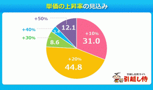 調査結果によると、回答した引越会社の20%が「顧客からの引っ越し依頼を抑える予定がある」と回答。引越料金についても50%以上が「上がると思う」、このうち7割以上が上昇率を「10−20%」とになると答えた。