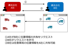 例えば協力運送会社とともに荷主からの受託業務にあたっているなどの場合、会社単位ではなく業務単位で複数企業を横断する形で車両位置を共有する、という利用方法が考えられる。