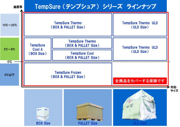TempSureシリーズは、保冷容器と蓄熱・冷却材を用いた「パッシブ型」(非電源式)の国際航空温度管理輸送サービスで、医療・医薬品、ケミカル品など厳格な品質管理基準が設定されている幅広い商材の温度管理輸送に対応。特に医薬品はGDPの認知が進む中、温度逸脱リスクの補償ニーズが多く、この保険の開発に至ったという。