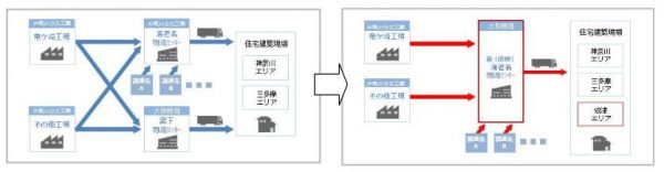 これまで大和ハウス工業竜ヶ崎工場から海老名市・相模原市の2拠点を中継し、神奈川県、東京都三多摩エリア向けに住宅部材を配送していた、配送エリアが重複し、作業負担が増える弊害が生じていた。