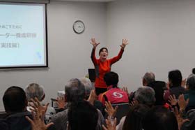 実技では、舌の動きや唾液の分泌に好影響を与える「お口の健口体操」、運動機能低下を抑制するための「ロコモ運動」、認知症予防に向けた「コグニサイズ」など、体を動かしながら学習した。