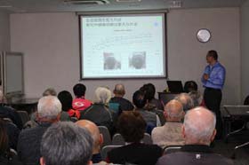 2月13日に同社会議室に近隣3自治会からの参加者と従業員あわせて60人が集まった。講義では「未病」の概念やこれに取り組む意義、実技ではさまざまなヘルスケア体操を学んだ。