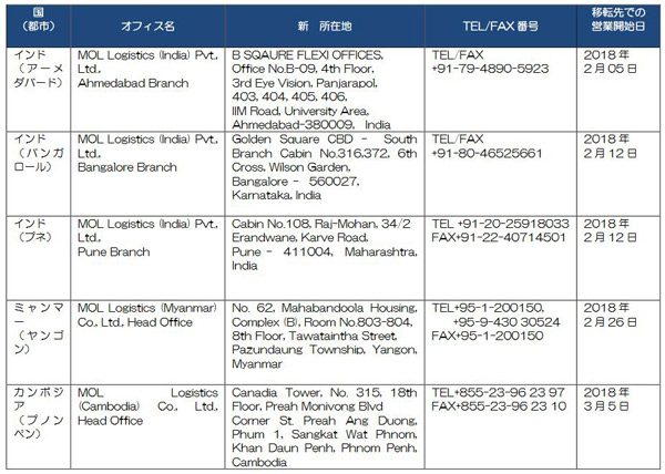 ロジスティクス商船三井ロジスティクスは6日、インド、ミャンマー、カンボジアの一部事務所を移転したと発表した。詳細は次の通り。