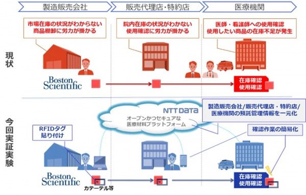 ロジスティクスNTTデータと医療機器メーカーのボストン・サイエンティフィックジャパン(東京都中野区)は7日、RFIDタグを用いた医療材料トレーサビリティーの実証実験を同日から開始すると発表した。