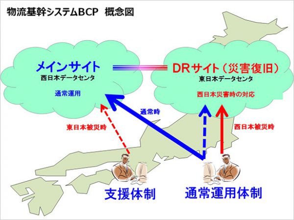 建物、セキュリティ、電気設備、空調設備、通信設備、 設備運用の評価が最高位レベル(ティア4)のデータセンターのメインサイトを西日本に置き、首都圏での大規模災害に備え、西日本での被災時には東日本のDRサイト(災害復旧)に切り替える「2拠点化」を実現した。