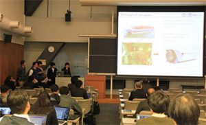 東京大学工学部講堂で開催した最終発表会では、それぞれのグループが英語でプレゼンテーションし、指導教授、学生、参加企業との間で活発な意見が交わされた。