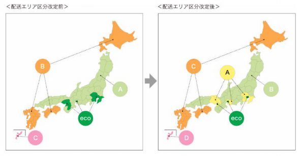 例えば従来の「ecoエリア」では、東京都全域(離島を除く)、神奈川県全域、千葉県全域、埼玉県全域、愛知県名古屋市、大阪府全域、京都府京都市(右京区京北・一部山間部を除く)、向日市、宇治市、八幡市、城陽市、長岡京市、乙訓郡大山崎町、久世郡久御山町、兵庫県神戸市(一部六甲山山間部を除く)、伊丹市、尼崎市、西宮市、宝塚市、芦屋市、明石市、奈良県(吉野郡を除く)を対象としていたが、5月1日からは東京都23区、名古屋市、大阪市へと変更。料金を390円(税抜)から490円へと100円値上げする。