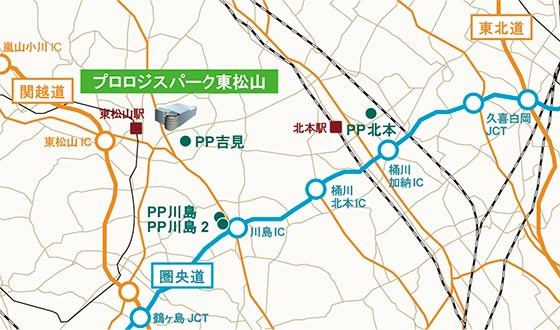 プロロジスパーク東松山は、国道407号に面し、関越自動車道東松山インターチェンジ(IC)から5キロ、圏央道川島ICから8キロに立地。関越自動車道や国道407号を利用することで都内だけでなく上信越方面へのアクセスに優れており、圏央道を利用することで関東全域や東北地方への広域配送にも適している。