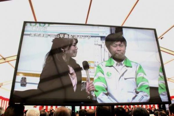 その後、新名神を利用して京都城陽配送センターに向かう同社のトラックが出発。同センターの従業員らが、開通祝のメッセージを記した横断幕を掲げながら見送る模様も中継された。