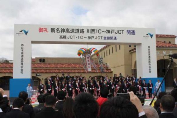 開通式典は同日10時から新開通区間に新設された新名神高速道路宝塚北サービスエリア(兵庫県宝塚市)で行われ、岡山早島配送センターからの映像生中継が4分間行われた。