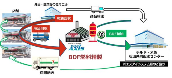 今回、実証実験に用いるバイオディーゼル燃料は、愛媛県内の家庭から回収された使用済み天ぷら油に加え、セブン-イレブンの店内で揚げ物惣菜を調理した後の食用油、弁当や惣菜などを製造する専用工場で使用した食用油を原料にしている。