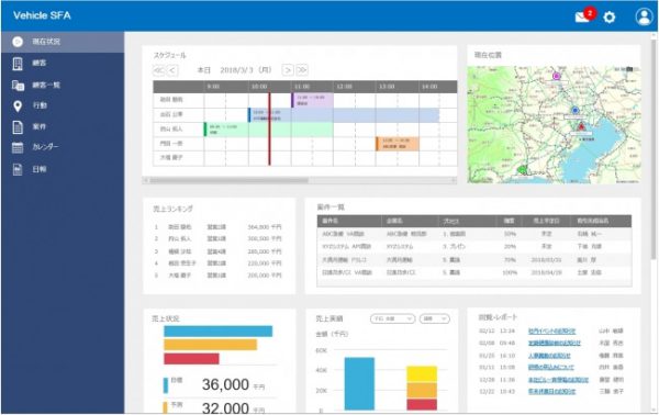 例えば営業管理システムなどに、地図を使った動態管理画面を追加して、車両などの現在位置を地図上に表示することが可能で、スケジュール通りに業務が進んでいるかなど進捗状況をリアルタイムに把握できるようになる。