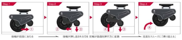 この製品は、高さ5センチまでの段差を容易に乗り越えられる新機構を搭載。主輪と副輪が連動して動くリンクカム機構によって、スムーズに段差を乗り越えることができる。段差を乗り越えることで、迂回する必要もなく作業負担を軽減、また、段差の衝撃で荷崩れを起こすことなく運搬時の安全性を保つことが可能となっている。