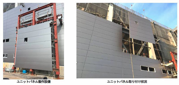 同工法は、地上で複数枚の外壁パネルを接合したユニットパネルを製作し、クレーンで吊り上げて、建物の躯体に取り付ける。フジタ施工の物流施設で同工法を採用し、外壁施工の生産性向上を実証した。