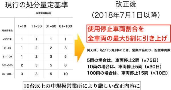 さらに、車両使用停止処分を受けた場合の「ダメージ」がより大きくなるよう、停止する車両数の割合を「最大5割」へと引き上げ、処分の実効性を高める効果を狙う。