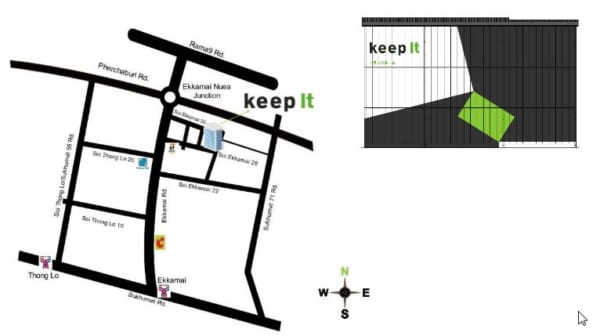 物件はメインロードのエカマイ通りから300メートルに位置。周辺には、住居やオフィス、レストランが多く、新CBD(ビジネス中心街区)のラーマ9通り、スクムビット通り、ペッチャブリー通りなどのメインロードからのアクセスに優れる。