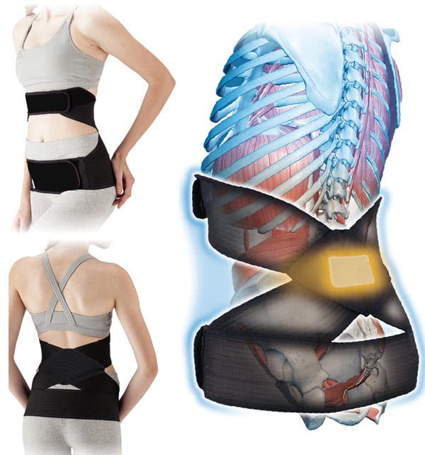 この製品では、骨盤の左右、腰椎の生理湾曲部分に後ろから押す力が働き、 最も上体重を分散しやすい背骨の生理湾曲を手助けする。筋肉を脱力しても強伸縮バンドが腰部を支持するほか、背中を押す力、骨盤を左右から引き合う力が働き、姿勢をサポートする。