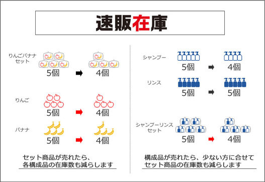 そこで、速販在庫にセット商品機能を追加し、セット商品と構成品の在庫数を連動させることができるようにした。セット商品が売れ在庫数が減った場合は構成品の各在庫数も減らし、セット商品の構成品が売れ在庫数が減った場合は、構成品の少ない方に合わせてセット商品の在庫数を減らす。