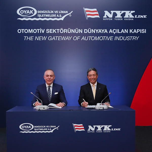 イスタンブールで5日、OYAKゼネラルマネージャーのスレイマン・サバシュ・エルデム氏、日本郵船の力石晃一専務経営委員が出席し、合弁会社の設立契約に調印した。