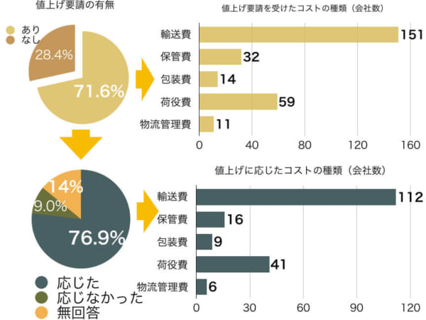 値上げを要請されたのは輸送費が97.8%で最多で、次に荷役費が多かった。16年度調査では、217社のうち132社(60.8%)が値上げ要請を受けたと回答していた。