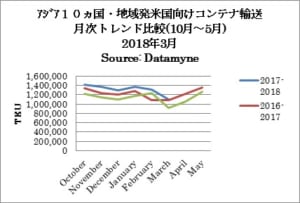 米データマイン(マイアミ)がまとめた3月のアジア発米国向け海上コンテナ輸送実績によると、アジア主要10か国・地域から米国へ向かったコンテナは13か月連続で増加し、3月は1.9%増の110万TEU、1月からの累計は9.7%増の379万TEUと過去最多を記録した。