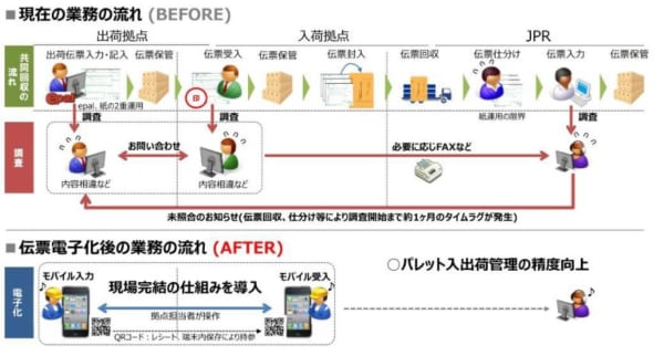 具体的には、紙伝票での運用を電子データに変更することにより、紙の管理や保管業務の負荷を削減するほか、伝票未作成などによる作業ミスの軽減、また現場完結の仕組みを導入することで未照合データの調査の負荷やFAX送信などの付随する業務を削減する。