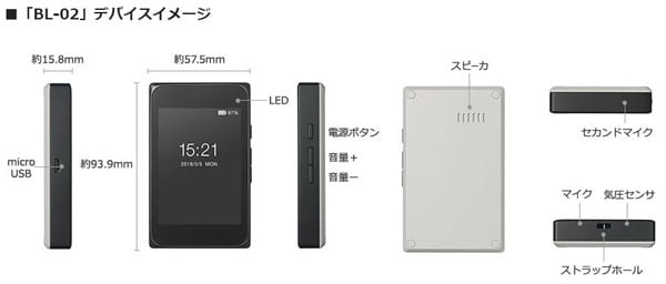 BL-02は102グラムの小型ボディに2.8インチディスプレイを搭載したAndroid端末で、10軸センサーやGPSを搭載。単体で位置情報や加速度、気圧データなどを収集するほか、Bluetoothや無線LANでセンサーからデータを収集することができるため、ゲートウェイとしての利用にも対応する。