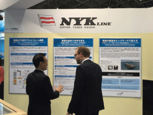 ブースではLNG燃料供給船、LNG燃料の自動車専用船など次世代燃料への挑戦、船舶の安全運航をサポートする衝突リスク判断と自律操船技術への取り組みなどをパネル展示しているが、シモンセン副大臣は、グリーンビジネスへの取り組みやビッグデータを活用したプロジェクトなどについて質問したという。