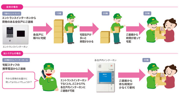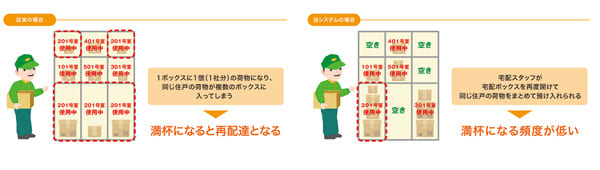 またインターホンシステムを改良し、宅配スタッフの携帯電話から住戸内のインターホンに直接連絡できるようにすることで、在宅確認から訪問までにかかる時間を短縮。宅配ボックスを改良し、荷物が入っているボックスに追加で入庫できるようにしてボックススペースを効率的に利用し、宅配ボックスが満杯になって再配達が増えてしまうという懸念に対応する。