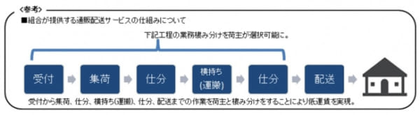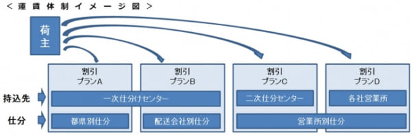 これまで運送会社が一元的に担ってきた「受付→集荷→仕分け→横持ち輸送→仕分け」を荷主の希望に応じて分担し、荷主が自社の業務内容や保有する作業機能に応じて価格が変動する体系を用い、支払い物流費を抑えることができるようにする。