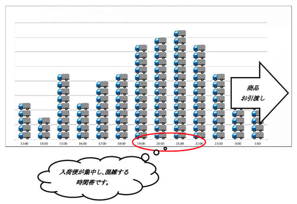 同社によると切花販売日の前日(日・火・木)の夜間に入荷便の到着が集中し、荷下ろし待機が発生している。通常期は荷受けを開始する13時から翌日1時台までのうち、最も少ない2時台と最も多い21時台では5倍の開きがある。